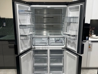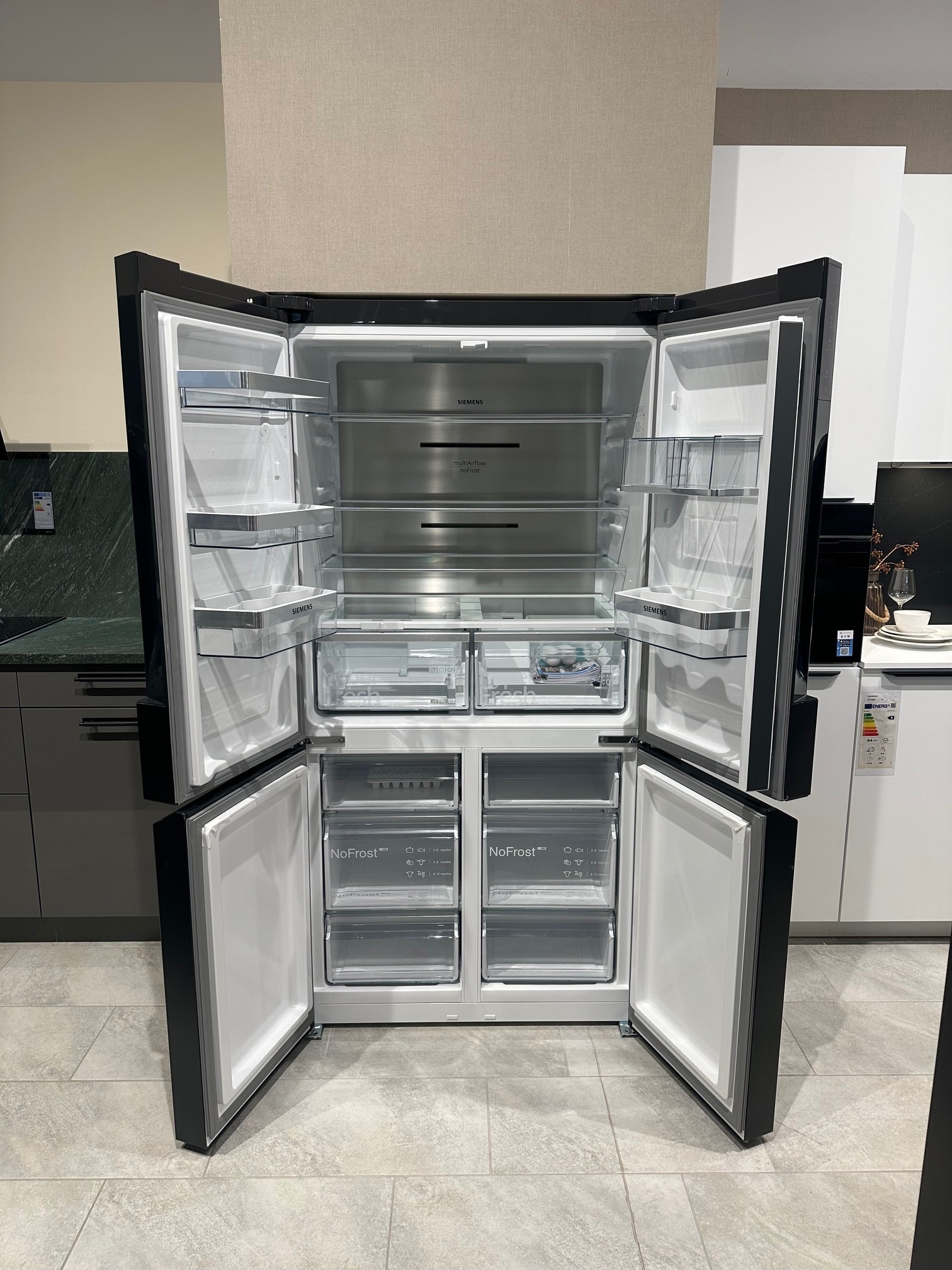 Hochwertige Nobilia Einbauküche Alpinweiß Matt inkl. Naturstein Insel. Hochwertige Siemens Einbaugeräte, inkl. Side-by-Side Kühlschrank und Massivholz Theke inkl. Massivholz Regalborde.